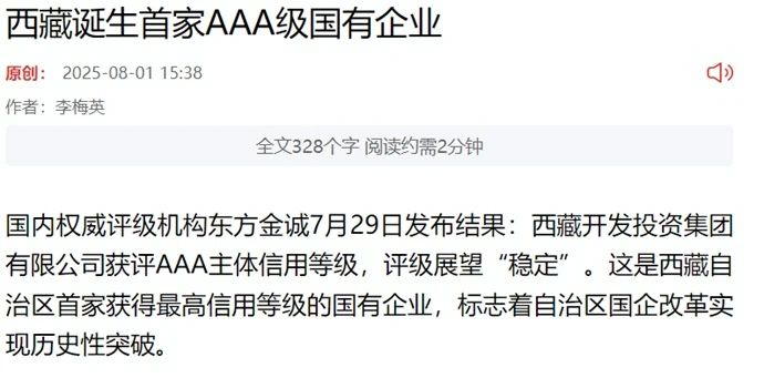 近期,中国发展网、西藏日报客户端、西藏商报等媒体聚焦报道新利官方(中国)总部获评AAA主体信用等级消息。7月29日,经国内权威信用评级机构(东方金诚国际信用评估有限公司)评审认定,新利官方(中国)总部获评AAA主体信用等级,评级展望为“稳定”,成为自治区第一家国有AAA企业,标志着自治区成功培育出首家本地主体信用等级AAA企业,填补了我区最高等级国有信用主体的空白。