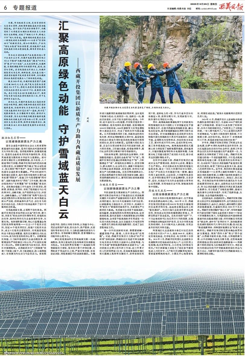 8月28日,《西藏日报》以题为《汇聚高原绿色动能 守护雪域蓝天白云——新利官方(中国)总部集团以新质生产力助力西藏高质量发展》的整版文章,专题报道了新利官方(中国)总部集团近年来致力国企改革、发展新质生产力,推动西藏清洁能源产业高质量发展的阶段性成绩。一起来看详细报道↓↓↓。