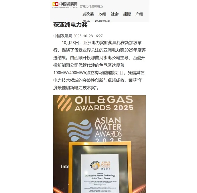 媒体报道丨色尼区达嘎普独立构网型储能项目荣获亚洲电力奖