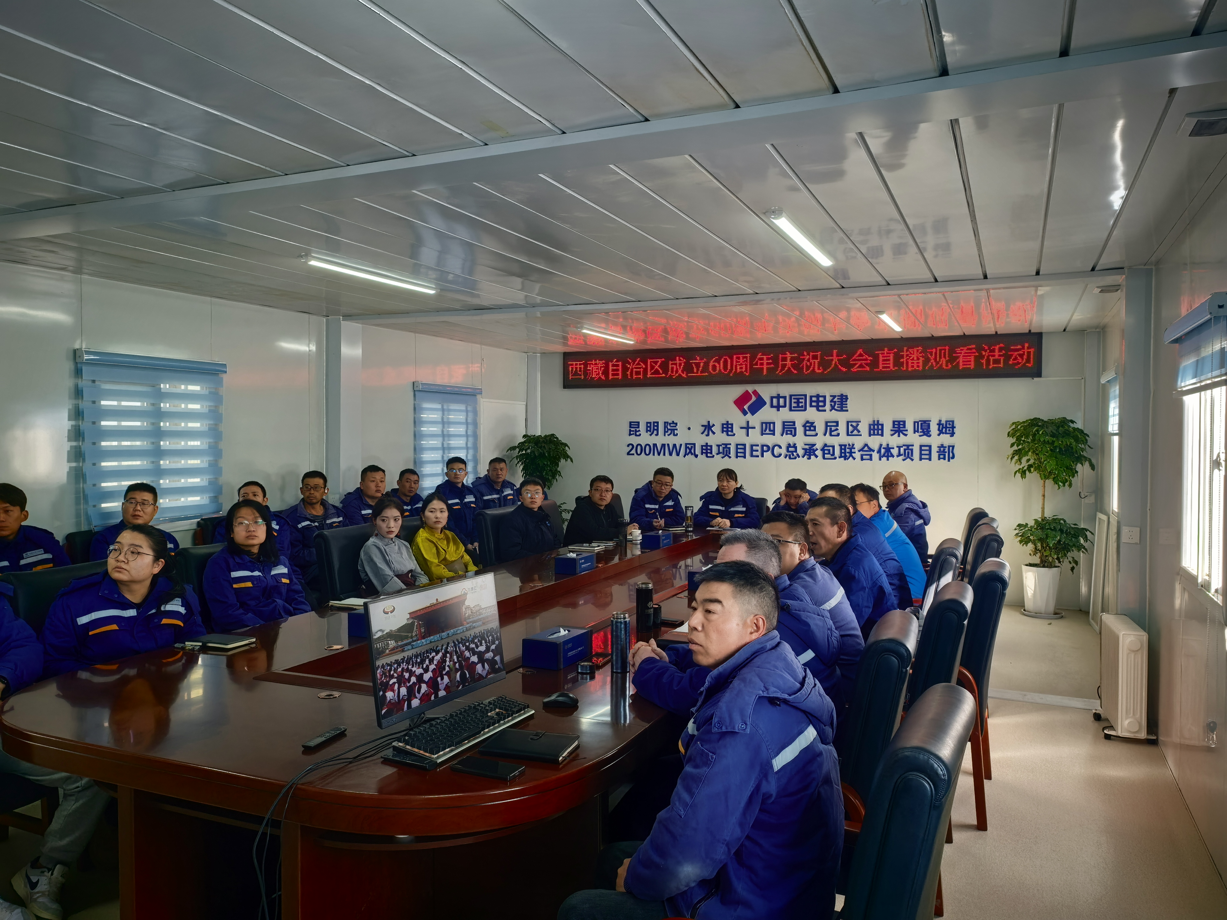 新利官方(中国)总部色尼区曲果嘎姆200MW风电项目组织观看西藏自治区成立60周年庆祝活动开幕盛况